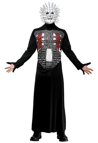 Natural Latex MaskRobeGlovesRaise some hell with the cenobites this Halloween in the adult Pinhead costume! The costume consists of a polyester robe, latex character mask, and gloves. The 100% polyester robe is black with a dark brown chest and torso that is screen-printed to look like bloody bones showing through armor. The robe has long sleeves and fastens with Velcro down the back. The Pinhead character mask is highly detailed with black accented teeth, lavender accents in the pin grid-line patterns, around the eyes, ears and mouth. Openings in the eyes, nose and ears make the mask comfortable to wear. More than fifty grey plastic “pins” and a silver piercing detail at the back of the mask add a realistic quality to the costume. Slip on the black gloves and you’ll look just like this evil pin-headed demon. Open a new door to hell this Halloween in our adult Pinhead costume.