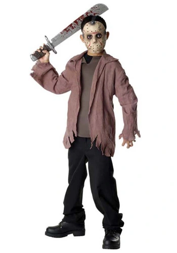 Jacket w/ attached shirt frontMaskThis boys teen Jason costume will turn any occasion into a horror movie! This teen costume includes a brown polyester jacket with an attached grey shirt front. The sleeves look jagged and tattered, just like Jason in the movie. The bottom of the coat also features a worn, frayed look befitting of any psycho killer. The costume also includes a deluxe foam Jason hockey mask. The mask is painted to realistic detail featuring red marking, shading near the mouth, eyes and sides. Holes near the mouth and nose allow for breathing and eyeholes provide clear vision. One eyehole has a mesh netting over it to give a shadowy creepy look to the wearer. It fits around the head comfortably with an elastic band that clasps with Velcro. Be sure to add one of our Jason machetes to be the star of your own slasher film.