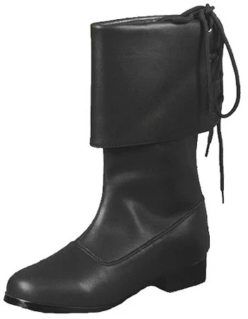 Child Black Pirate BootsFaux Leather ExteriorBack Zipper ClosureFabric LiningThese children’s Black Pirate Boots are perfect to complete your child’s look! They have a faux leather look to them and an oversized cuff that comes down to about the middle of the boot. The cuff can lace up for a tighter or looser fit. They also have a zipper in the back, soft lining made out of foam for comfortable walking, and grips on the sole to prevent slipping off of the ship. This accessory is a necessary addition to any pirates outfit.