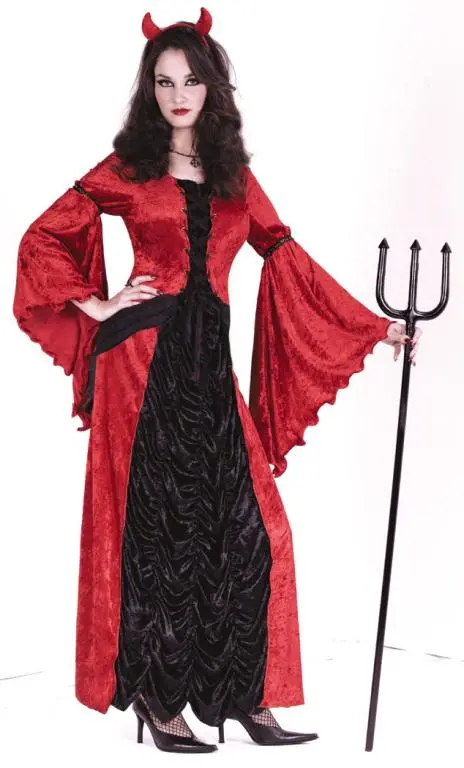Devilishly Hot And Elegant PrincessVelvet dress with coffin lining material inset, lace tie front, bustle, devil horn headpiece and armbands.Available sizes:
