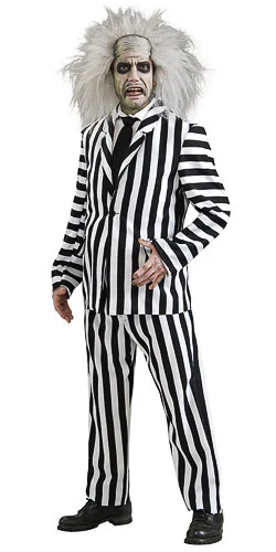 JacketDickiePantsBecome the unruly ghost from Tim Burton’s Beetlejuice! This deluxe licensed Beetlejuice costume for adults features his classic black and white striped suit from the movie. The polyester jacket has vertical stripes on the chest and back with contrasting horizontal stripes on the sleeves. There is a single button in front for closure and two faux pocket flaps on either side. The white dickie with an attached black necktie slips on over the head and ties behind the neck and on the sides. The coordinating striped polyester pants have and elastic waist along with a zipper and Velcro closure in the front for a secure fit. Get our Beetlejuice makeup kit to complete this freaky costume for Halloween!