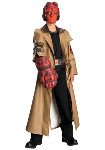 HeadpieceCoat w/ attached shirtHandFace makeupYou child will transform into a superhero demon with this deluxe child Hellboy costume! The kids costume consists of a polyurethane jacket with attached polyester shirt. The costume pulls on over your head and velcros behind your neck. The right sleeve features dark brown straps with metal loops and the left sleeve has a screen printed patch that says “Bureau for Paranormal Research and Defense”. The black shirt features a screen printed belt. Also included is a foam Hand of Doom that attaches to your arm with elastic straps and a latex Hellboy headpiece. There is also red face makeup to give your child an authentic Hellboy appearance! This licensed Hellboy costume is a fun superhero costume for boys!