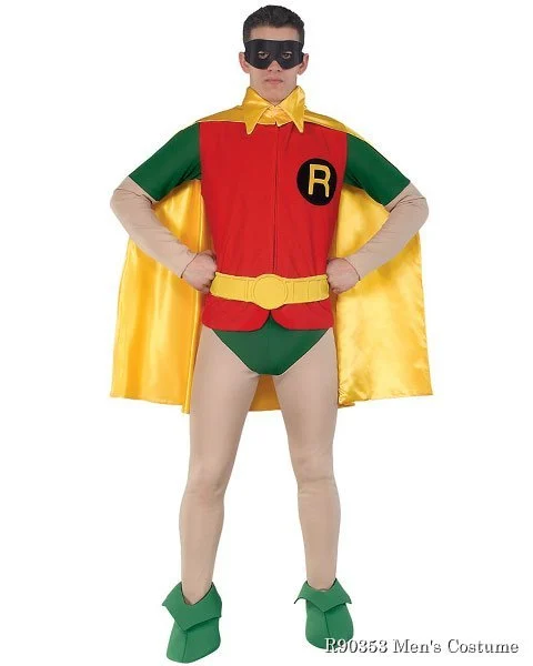 Robin is the classic comic book Boy Wonder and sidekick to the notorious crime fighting Batman. The Deluxe Regency Robin Mens Costume features the total Robin costume with some modifications so that men who don’t want to bare any skin can feel comfortable as this popular comic hero. The Regency Robin costume features a red shirt with the R logo on the chest and long sleeves that are flesh colored on the bottom so that at a distance it looks as if the top has green short sleeves. The Robin costume also includes a pair of flesh colored pants that look like you are wearing only a pair of green briefs. Regency Robin costumes also come with a pair of green shoe covers, and a yellow cape with an attached collar. This costume can be worn on its own but is an even better look when paired with a friend dressed as Batman.