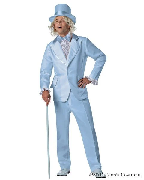 Be part of America’s favorite classically goofy movie in the Dumb and Dumber Harry Blue Tuxedo Adult Costume. Harry is Lloyd’s best friend and road trip mate as they travel across the country to return a briefcase to Lloyd’s love interest Mary. This Harry Tuxedo costume features a powder blue long sleeved 70s style suit jacket and suit pants. Underneath the suit jacket we include a light blue ruffle dickie with blue bow tie and cummerbund. At the sleeve cuffs of the jacket are light blue ruffle sleeves that add a little extra pizzazz. To add realism, consider purchasing a Harry inspired blonde wig and a cane. This Harry Light Blue Tuxedo outfit is perfect for a Halloween costume party. For those attending Halloween costume parties together, consider purchasing the Dumb and Dumber Lloyd Orange Tuxedo so you can attend as a hilariously themed pair.