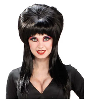 Black Costume WigComplete your Elvira costume with this authentic and inexpensive wig! The black wig is made from synthetic fibers and styled with Elvira’s signature look. It is lined with mesh on the inside for a comfortable fit and built-in elastic secures the wig in place. Transform your look instantly with this wig!