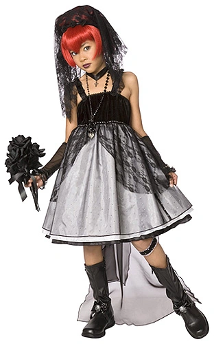 DressGloveletsChokerVeilGarterThis Halloween, say I do in this girls Gothic bride costume! The fun and spunky costume includes a polyester dress that has a black, velvet top and shoulder straps embellished with black rosettes. The black skirt is accented with rhinestones along the waist and black lace shells. The skirt consists of two additional layers including tulle for extra volume and a silver layer covered with a sheer black overlay. This overlay is decorated with silver glitter polka dots for extra goth glam. The black bow in the back has an attached sheer black train that hangs below the dress. A black lace veil is attached to a headband that is decorated with rosettes. The costume is complete with a black choker (please note the choker does not have a cross charm as pictured), pair of black fishnet fingerless glovelets and a garter. The elastic garter is black with white trim and features the same silver glitter polka dots as the skirt. You’ll be ready to walk down the aisle when you add our black rose bouquet!