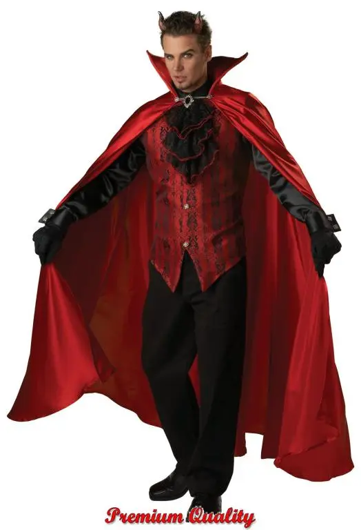 This costume includes a full length red satin cape, brocade vest with attached black lace jabot and jeweled medallion, black gloves and vinyl devil horns.