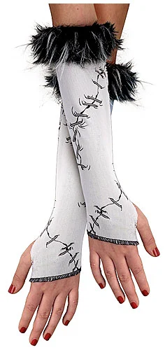 Stitch Pattern Glovelettes w/Fur CuffAdd these kids stitched glovelettes to your gothic bride costume for a complete look! The white glovelettes are made from a polyester and spandex blend. They are lined with black and grey faux fur on the end and feature screen printed black and grey stitches. Get gothic perfection when you add our coordinating tights!