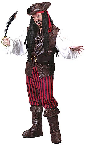 Pirate Shirt w/attached VestCropped PantsBandanaBeltBoot TopsPirate HatSearch for treasure with this Male Caribbean Pirate Costume! It’s shirt is made out of polyester and is attached to a lace-up faux leather vest. Black and red striped pants with an elastic waist come down to the shins. A pair of leather-like boot covers, a red bandana, and faux leather belt and buckle complete this costume’s authentic pirate appearance!