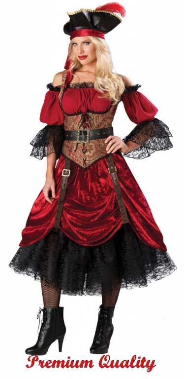 You will make a grand entrance in this super deluxe Theatrical Quality costume utilizing superior materials and trimmings along with true garment finishing. This style is available in multiple sizes for true apparel fit. The quality will be seen, felt and admired! Costume includes a mid length dress, black trimmed lace-up brocade vest, tulle and lace petticoat, belt and hat with bandana and feather.