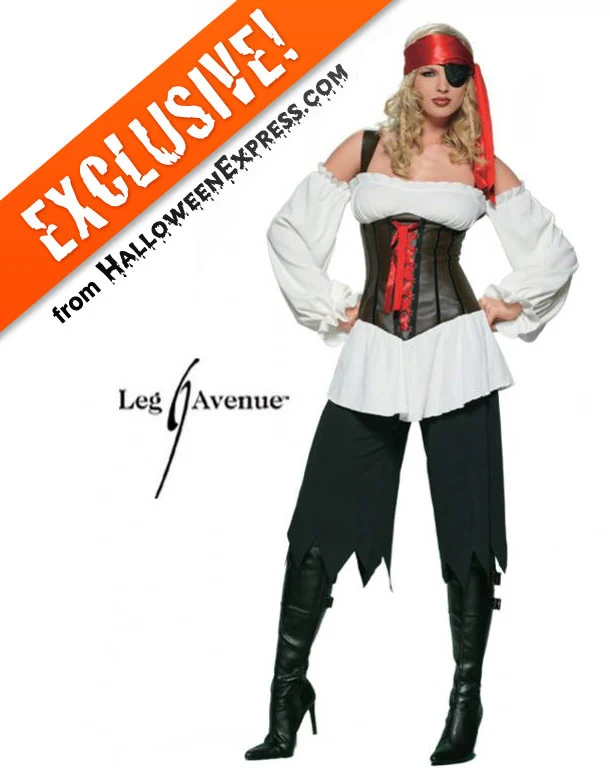 Wow! Shiver Me Timbers! You’ll Steal Attention In This Sexy Costume! This very sexy pirate costume includes: Black gaucho pants and white off the shoulder top withbrown lace up corsett. Costume also includes head band and eye patch. Available sizes: