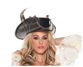 Pirate Hat w/FeathersComplete your Rouge Pirate costume with this beautiful hat. This black PVC hat looks like leather and features black and silver braid details with intricate faux silver buttons. The inside of the hat has a velvet-like fabric and two iridescent feathers fit into the top of the hat. You’ll be ready to captain any pirate ship this Halloween!