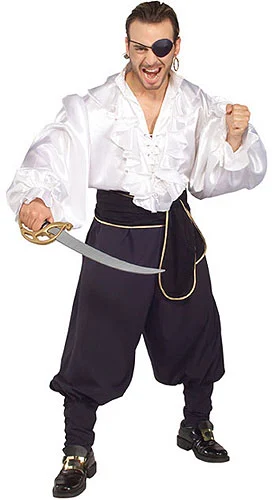 White Pirate ShirtWaist SashBlack Cropped PantsThis Swashbuckler Pirate Costume will ready you for the high seas! The classy satin shirt fits loose and can be laced up the chest. It also has little ruffles around the collar and sleeves. The polyester pants have elastic in the waist which adds to the comfort of the costume as well as lace-up shin cuffs. A black sash which has been trimmed with gold colored material adds the finishing touches to this stunning and authentic looking costume!