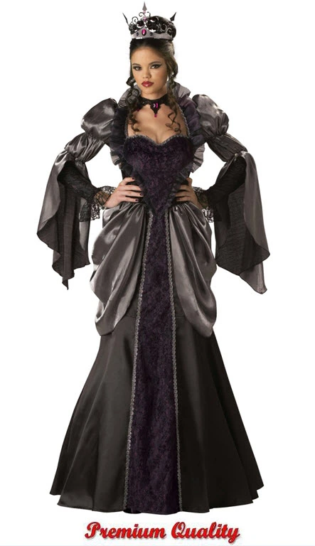 You will make a grand entrance in this super deluxe Theatrical Quality costume utilizing superior materials and trimmings along with true garment finishing. This style is available in multiple sizes for true apparel fit. The quality will be seen, felt and admired! This costume includes a full-length long sleeve gown with attached peplum and sweeping hem; petticoat, sequined crown and jeweled lace choker.
